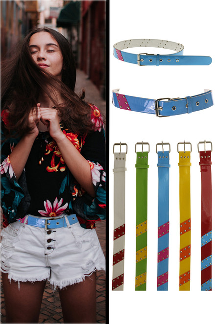 Striped leather belt in assorted colors. 1 7/8" wide x 42" long.