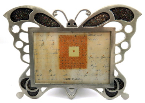 Silver tone butterfly shaped picture frame with glitter painted wings. Frame stands about 5 1/2 inches tall and 8 inches wide and holds a picture sized 3 1/2" x 5".