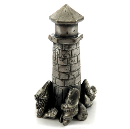 Pewter candle snuffer in shaped of a wine shaft with clusters of grapes surrounding the shaft.