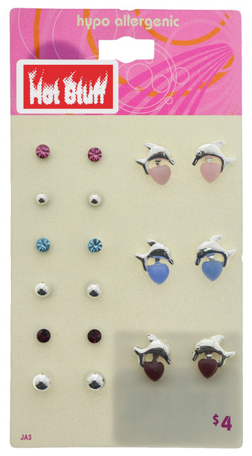 9-pair on a card. 6 are studs and 3 are dolphins with bead accents. They are prepriced at $4, you get 12 sets for $9.00.