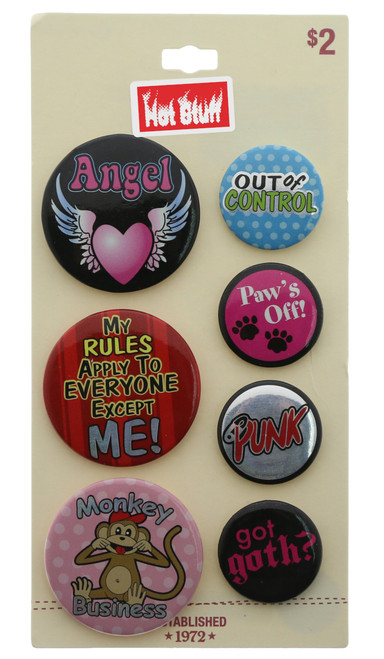 Hot Stuff 7 pins with sayings per card on a pink card. Sayings include: Angel, Out of Control, and Paws off. You get 12 cards for $9.00.