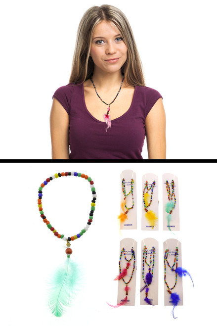 Necklace bracelet set, nb2318, assorted color feathers, with multi-color beads, each set is individually carded, 12 cards per unit. (you receive 12 necklace bracelet sets for $6.00)