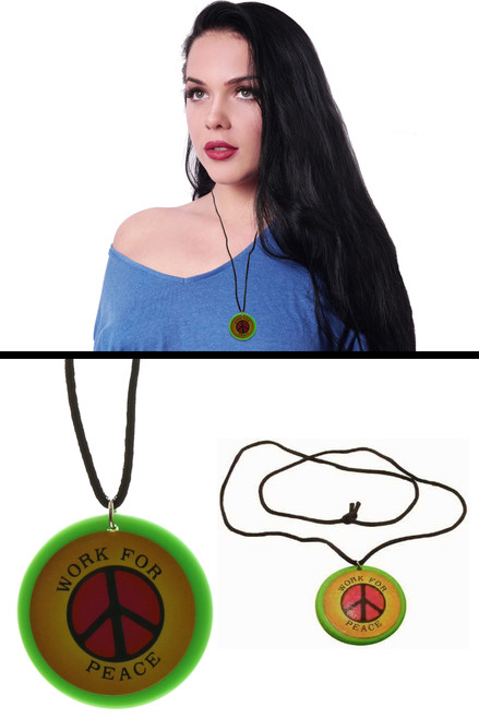 Teen necklace, n88, black cord, with acrylic pendant, pendant has "WORK FOR PEACE" on it and a peace sign emblem, 18 inch, 12 per unit. (you receive 12 necklaces for $6.00)