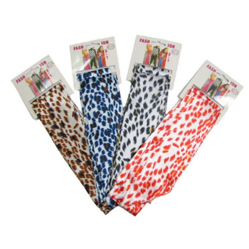 Polyester multi-use fashion scarf, approximately 6 ft x 2¼", can be used as scarf, belt or head-wrap, assorted color animal prints, each is individually carded and poly bagged, 12 per unit, you receive 12 scarves for $7.00