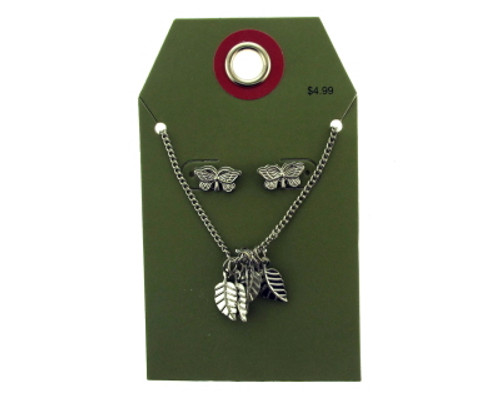 Silver tone necklace and earring set with butterfly stud earrings and five leaf charms on the necklace. You receive 12 cards for $12.00.